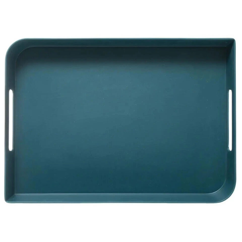 Dienblad/serveerblad rechthoekig petrol blauw. Dit serveerblad beschikt over handige handvaten en heeft een moderne uitstraling omdat het zowel ronde als puntige hoeken heeft. Makkelijk schoon te maken met een vochtige doek. Afmeting: 35 x 25 x 4,5 cm. Materiaal: kunststof.