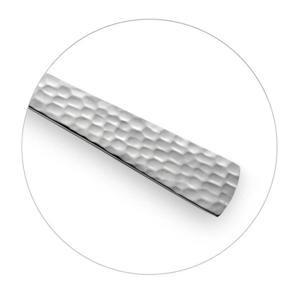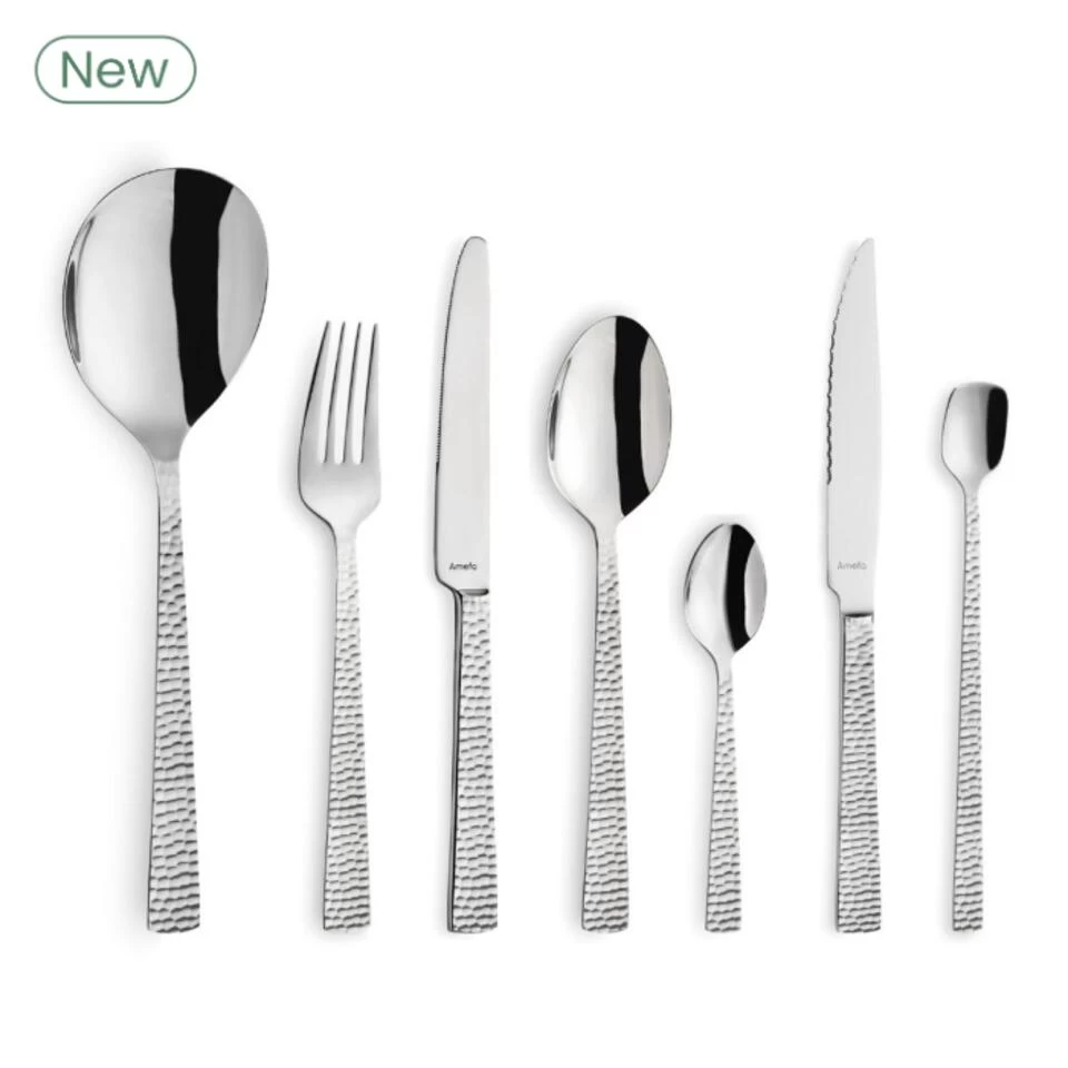 Felicity bestek van Amefa brengt het gevoel van eigentijds handwerk op tafel door de grove, gehamerde decoratie op het heft. De gekleurde hoogglans afwerking geeft een stijlvolle en moderne twist aan elke tafelsetting. De gehamerde decoratie op het handvat zorgt voor een mooie reflectie op het bestek waarbij de glans perfect tot zijn recht komt.