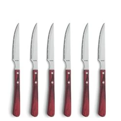 Deze traditionele set bestaat uit zes scherpe 13/0 hoogwaardige roestvrijstalen steakmessen met pakkahout halve lemmet-heften en 2 klinknagels. Bovendien is deze set vaatwasmachinebestendig en biedt het gebruikte chroomnikkelstaal met micro-gekartelde randen een hoge corrosieweerstand.