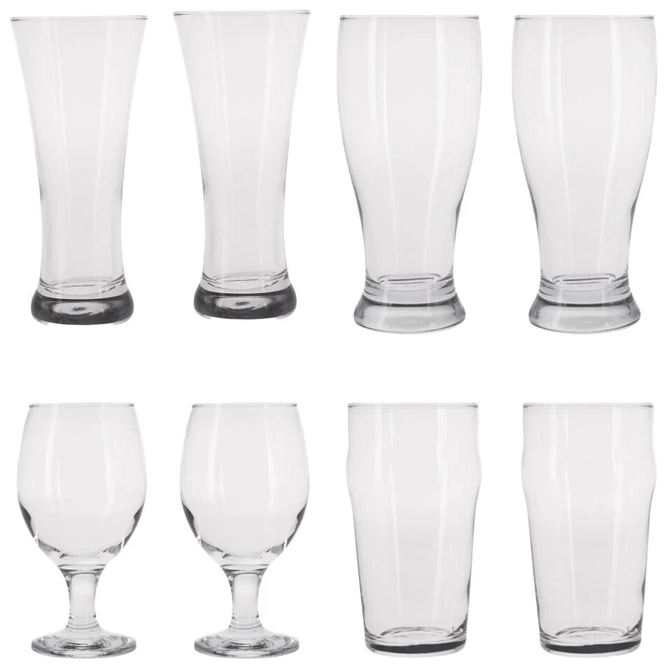 Speciaal bierglazen set van 8x stuks in 4 verschillende soorten. Je ontvangt 2 stuks per bierglas soort, geschikt voor verschillende biersoorten zoals speciaal bier. Inhoud: 2x 400 ml, 2x 380 ml, 2x 565 ml en 2x 570 ml. Materiaal: glas. Geschikt voor in de vaatwasser.