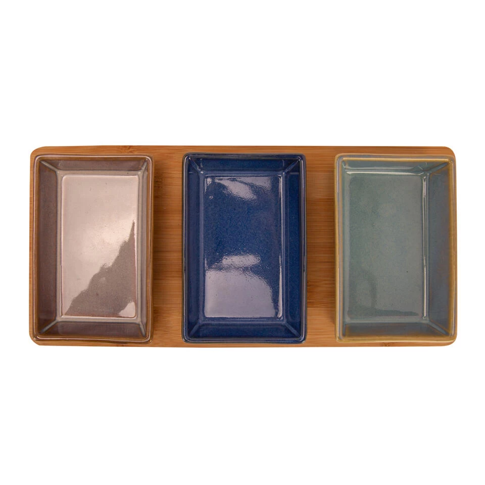 Serveerplank bamboe 31 x 15 cm met 3x luxe hapjes/saus/tapas schaaltjes. De gekleurde schaaltjes zijn ongeveer 13 cm lang, 8 cm breed en 5 cm hoog. Serveer uw gerechten met deze mooie set tijdens diner of borrel. Langwerpige serveerset.