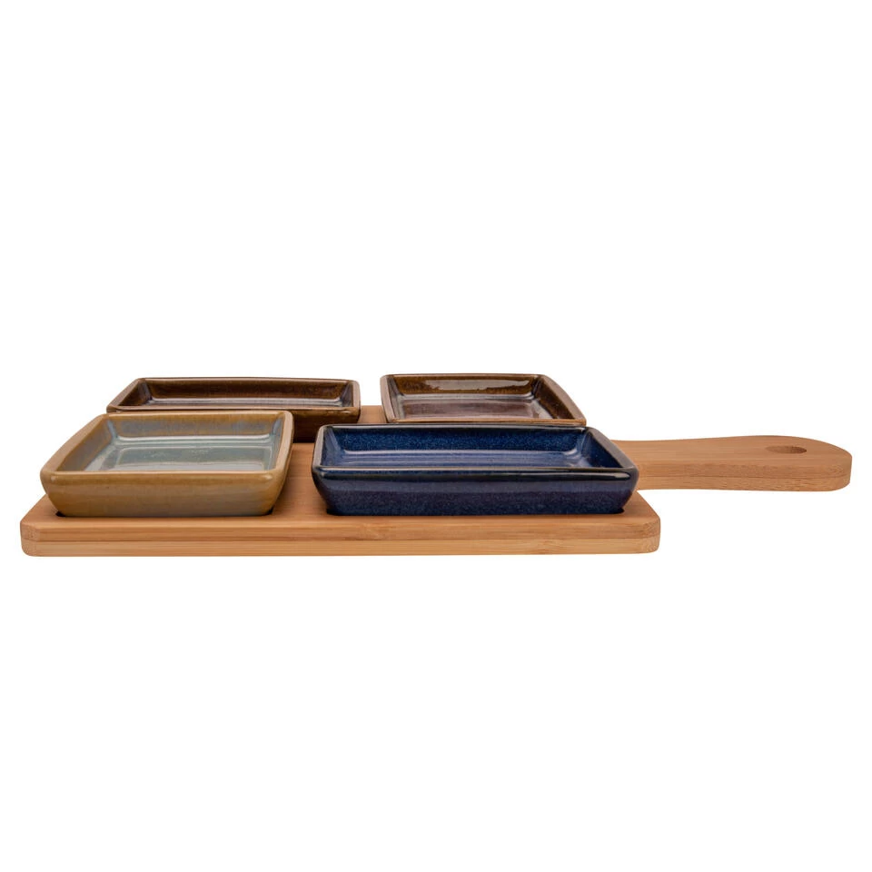 Serveerplank bamboe 29 x 20 cm met 4x luxe hapjes/saus/tapas schaaltjes. De gekleurde schaaltjes zijn ongeveer 10 cm lang en 7 cm breed. Serveer uw gerechten met deze mooie set tijdens diner of borrel. Vierkante serveerset.