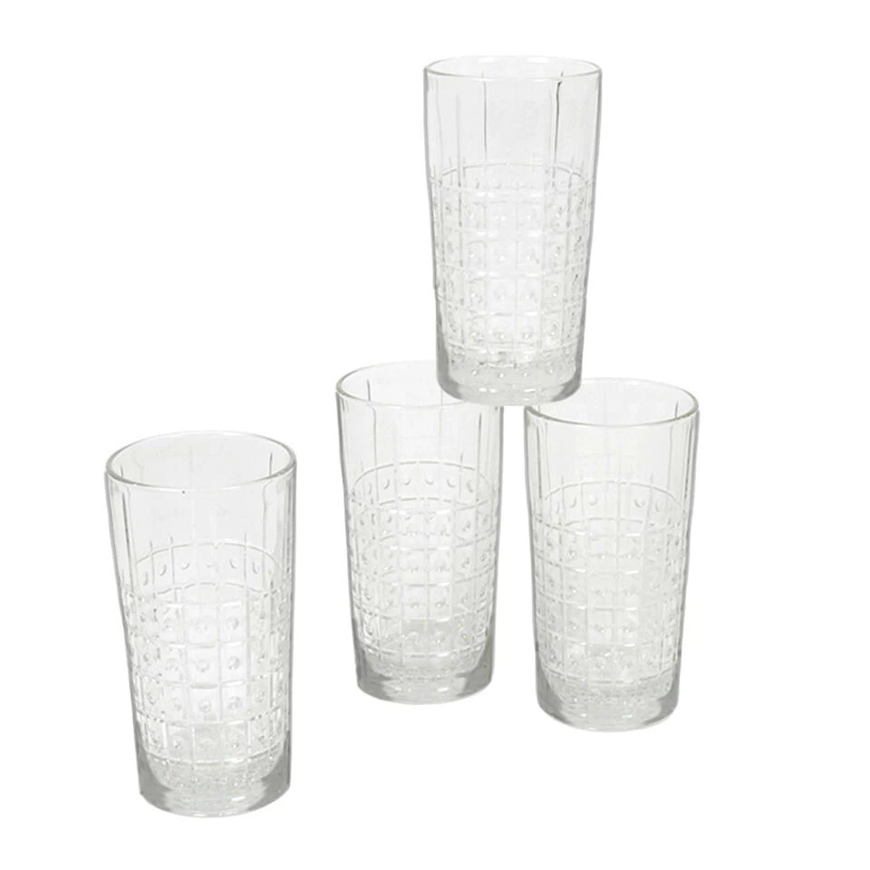 Een set met 4x Longdrink glazen met motief/relief. Inhoud: 490 ml (49 cl).