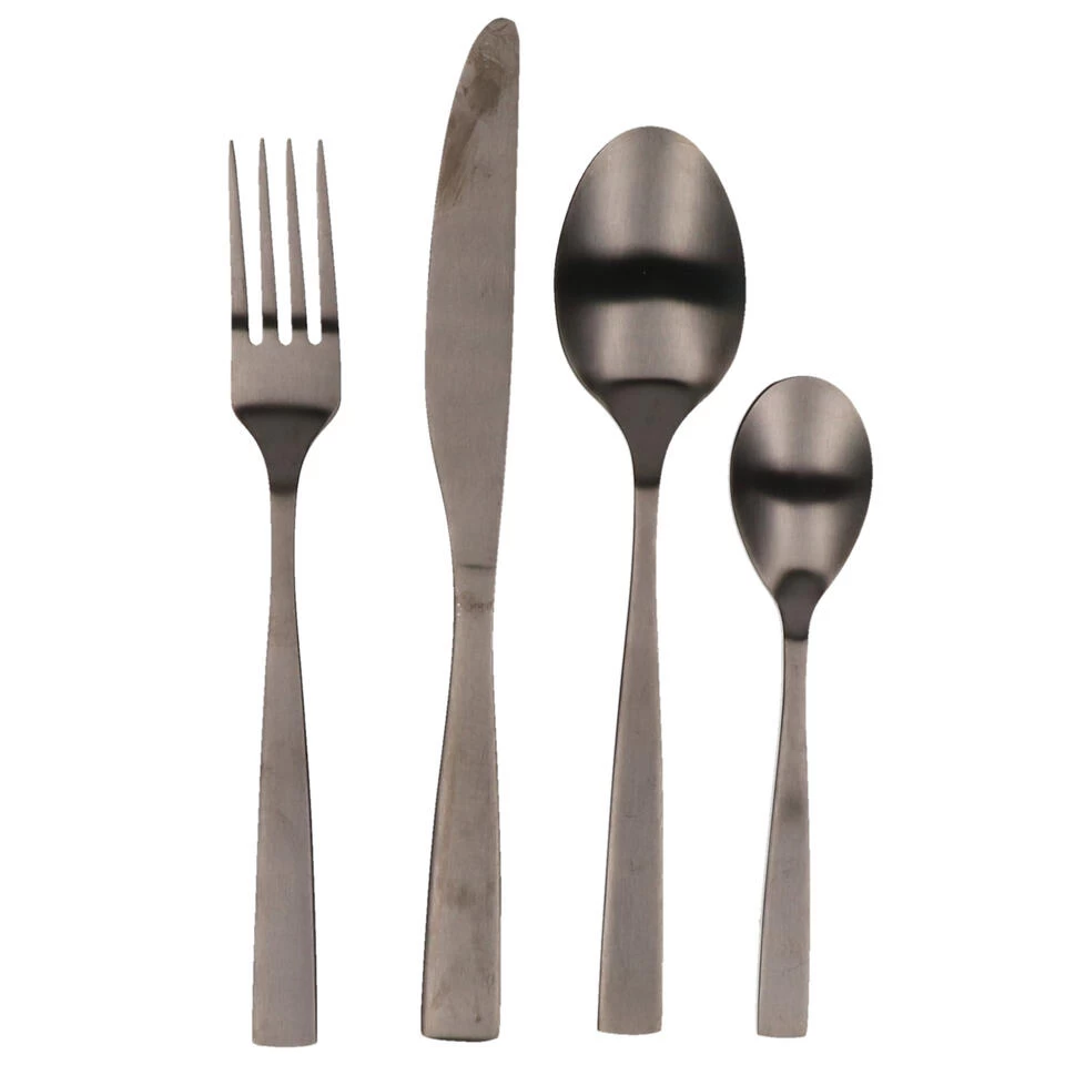 Bestekset 16-delig glans zwart voor 4 personen. Deze 16-delige bestek set bestaat uit 4x vorken, 4x lepels, 4x messen en 4x theelepels en is geschikt voor 4 personen (4 couverts). Materiaal: RVS. Kleur: glans zwart. Vaatwasmachinebestendig: Nee, handafwas wordt aangeraden voor een langdurig behoud van de kleur.Tafelbestek voor ontbijt, lunch en diner.