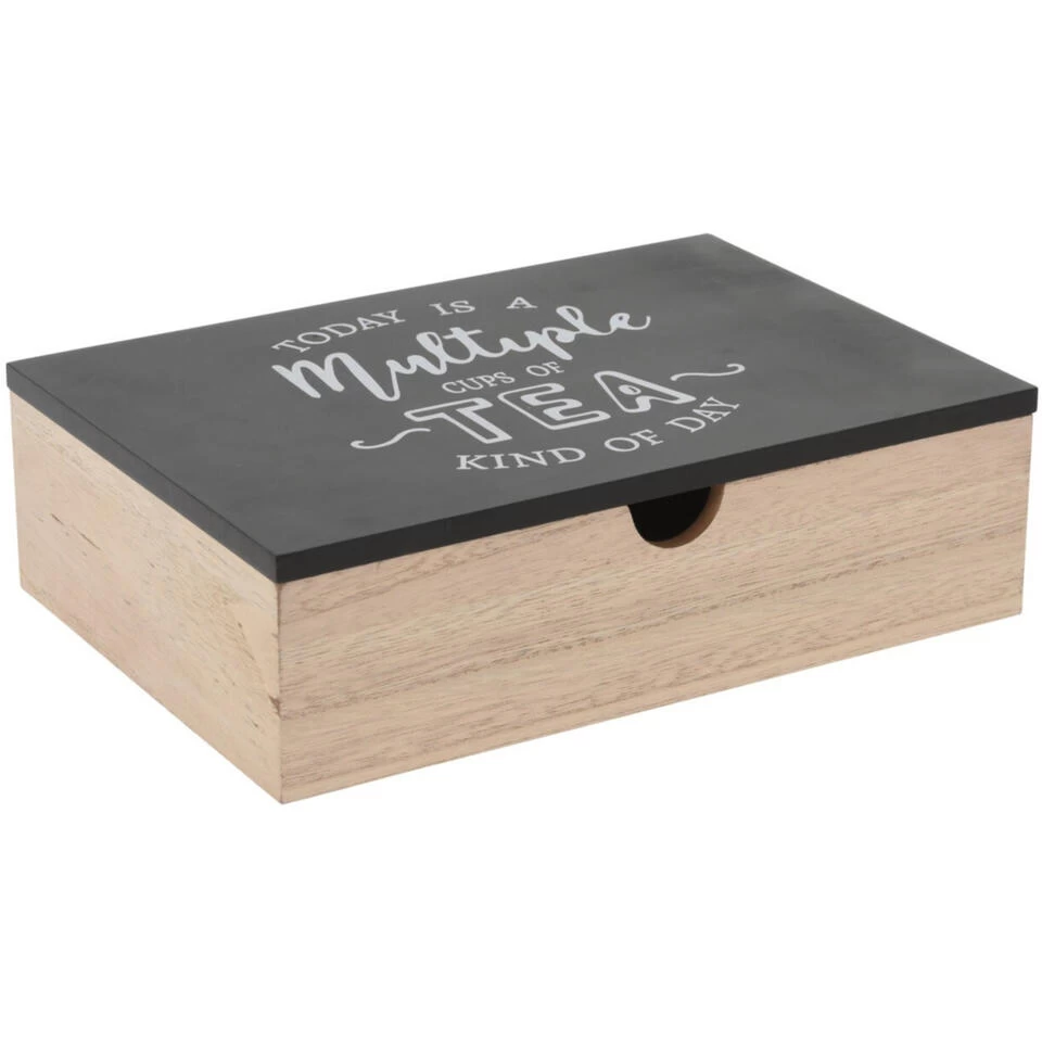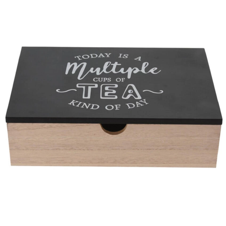 Houten theedoos/theekist antraciet/bruin met 6 vakken 24 x 16 x 7 cm. Vierkante 6-vaks theedoos voor het bewaren van diverse soorten thee/theezakjes. Met antraciet kleur houten deksel met de tekst ‘Today is a Multiple Cups of Tea Kind of Day’.