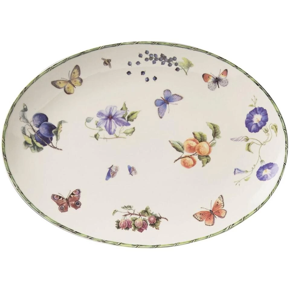 Deze schaal is onderdeel van het Fruit amp Flowers-servies van Janneke Brinkman-Salentijn. Haar kleurrijke en natuurgetrouwe illustraties zijn zo prachtig geschilderd, dat het bijna zonde is om het ovale schaaltje te gebruiken. We begrijpen het daarom volkomen als je deze gewoon als eyecatcher in je servieskast zet.