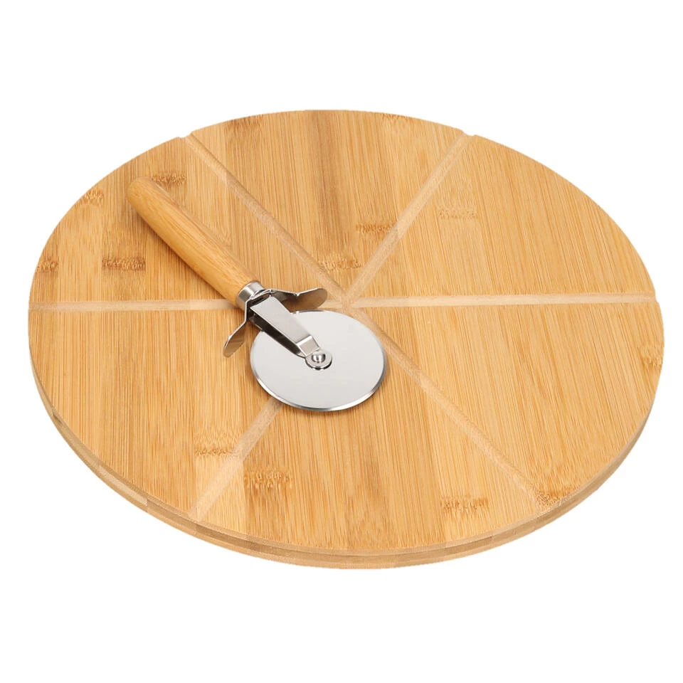 Bamboe houten pizza serveerplank met pizzasnijder 32 cm. Rond plateau voor het snijden en serveren van pizzapunten. Dankzij de uitsnede/groef snijdt u gemakkelijk gelijke stukken. Het pizzames met ronddraaiend snijvlak zorgt ervoor dat u de pizzabodem gemakkelijk doorsnijdt. Bamboe is een hard en slijtvast materiaal en zal niet krimpen of uitzetten zoals andere houtsoorten dat doen.