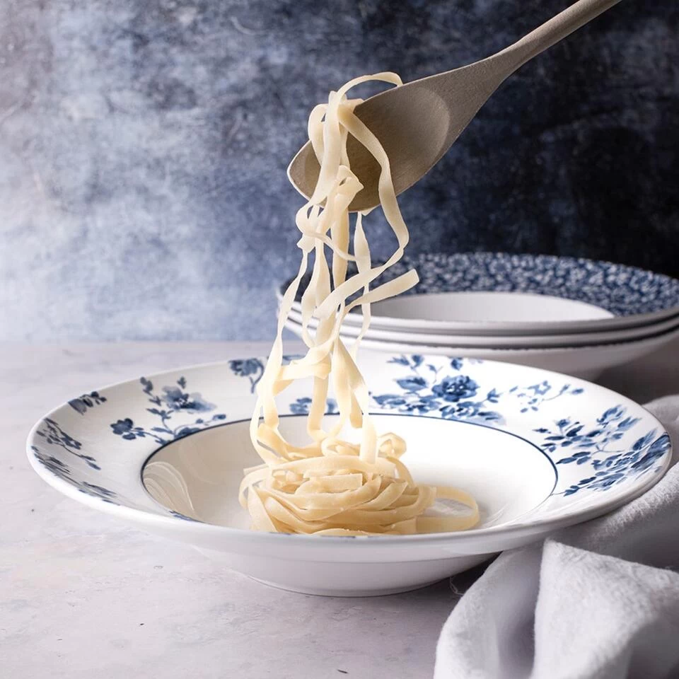 Pasta is altijd een goed idee. Al helemaal als je visite krijgt. Met de meest natuurlijke en basic ingredieumlnten bereid je namelijk al een heerlijk pastagerecht. Het is eacutecht even alsof je op een zonnig terras in Rome bent. Serveer de maaltijd in dit stijlvolle porseleinen pastabord van 27,5 cm: het bord is extra diep zodat er lekker veel in kan. Zo tafel je urenlang met de liefste mensen om je heen. Kleed je eettafel extra mooi aan met de diverse andere prints uit de Blueprint Collectables van Laura Ashley.