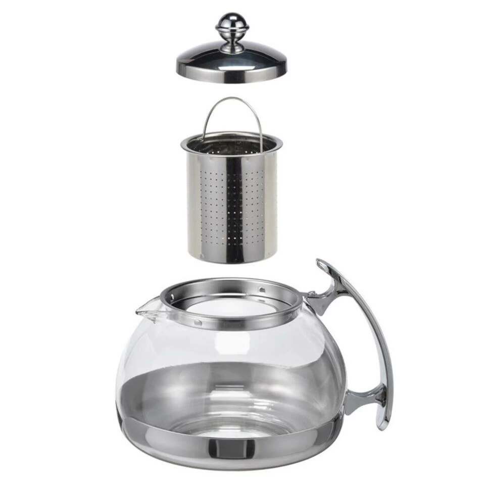 Theekan / theepot met filter inzet infuser 1,2 liter. Deze theekan / theepot is gemaakt van hittebestendig glas, heeft een RVS houder en chromen handgreep