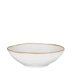 Rustiek en robuust, zo kan het Tabo servies van Mica Decorations het beste worden omschreven. Geen wit porselein met saaie volmaakte lijnen, maar handgemaakte producten van keramiek in neutrale tinten. Elk met een eigen, authentieke look die past bij puur genieten. Nu heeft deze keramieken schaal van H7,5 x Ø23,5 cm ook een witte kleur, maar dan met een bruingekleurd randje en een ambachtelijke uitstraling. Mooi in elk interieur en voor van alles te gebruiken! Bijvoorbeeld voor een pasta, een salade of wat brood. Het diepe bord is hittebestendig tot 180 °C en kan zowel in de magnetron als in de vaatwasser worden gezet. Combineer dit product met andere items uit de Tabo serie en maak het servies compleet.
