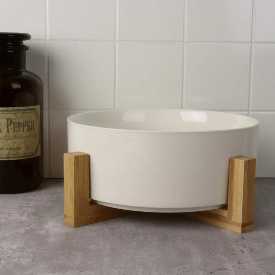 Stevige Slakom set gemaakt van keramiek van het merk Orange85. De saladeschaal heeft een diameter van 23,5 cm en een hoogte van 8 cm. De schaal is gemaakt van keramiek en de standaard waar de schaal op rust is van bamboe materiaal. Bamboe heeft een lange levensduur, is hard, slijtvast en duurzaam. De kom is vaatwasser bestendig.