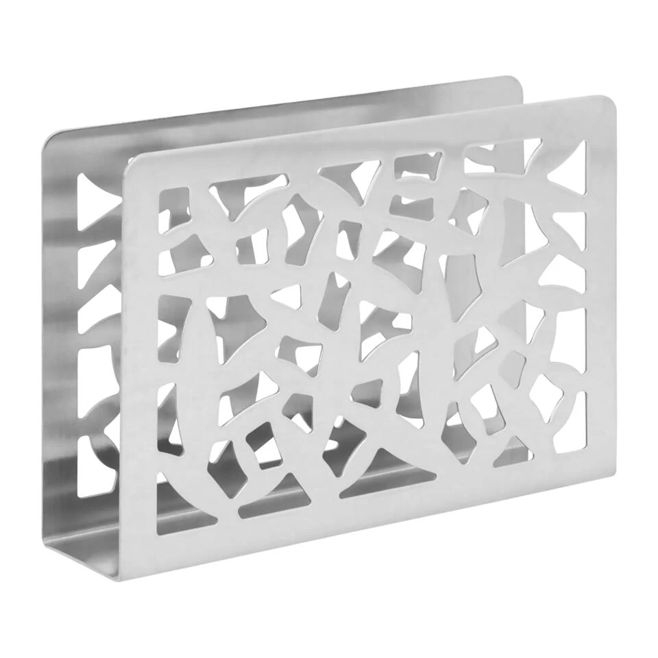 De servettenhouder is rechthoekig en heeft de kleur zilver. De servethouder gemaakt van rvs heeft uitsparing aan de zijkanten in een abstract patroon. Je ziet de servetten dus deels door de houder heen en het patroon zorgt ervoor dat deze servet accessoires er aantrekkelijk uitzien.