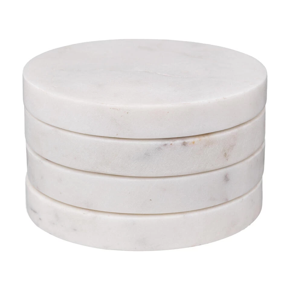 Set van 4x ronde onderzetters voor glazen wit. Deze onderleggers zijn uniek omdat ze allemaal lichtelijk van elkaar verschillen en hebben daardoor een stijlvolle uitstraling. Afmeting: ca. 10 x 10 x 1,5 cm. Materiaal: Marmer.