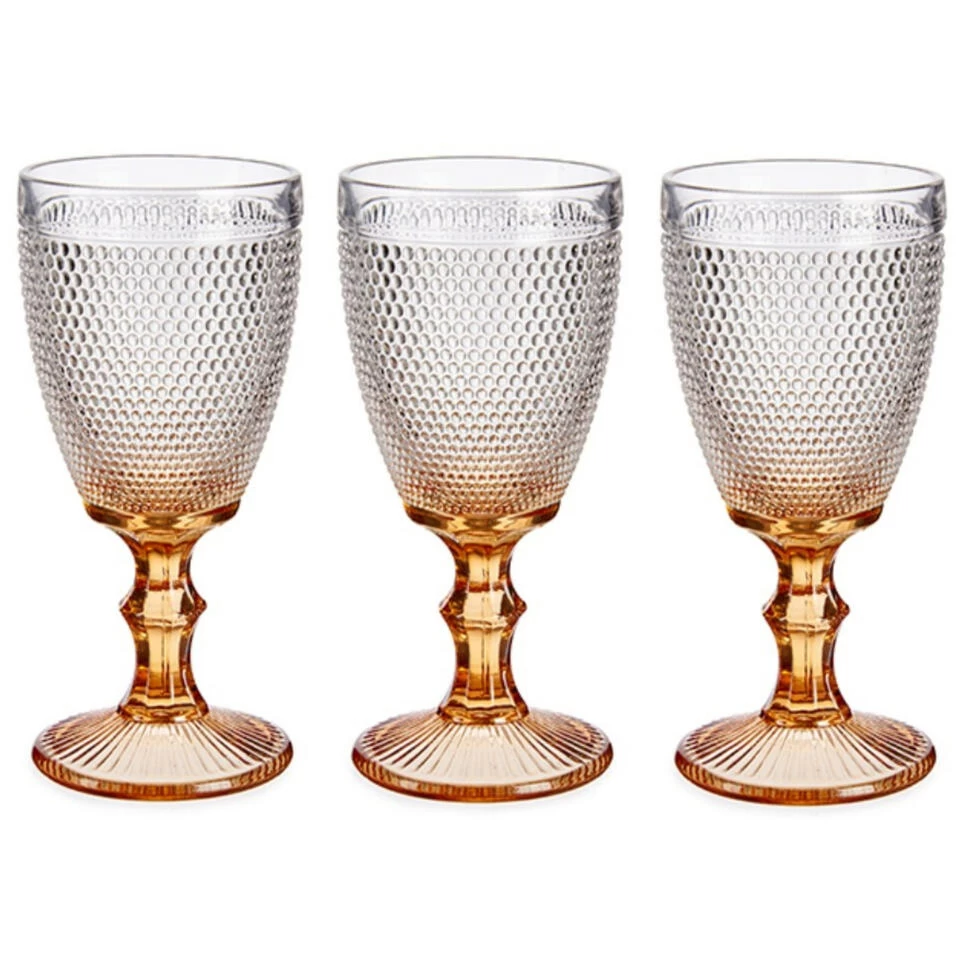 Luxe Monaco serie Cava of Wijnglazen set van 6x stuks op goud/amber gekleurde voet 330 ml. Geschikt voor rose, witte en rode wijn. Prachtige luxe uitstraling glazen collectie van Vivalto. De voet is goud gekleurd in het glaswerk, de bovenzijde is transparant. Formaat per glas 8 x 17 cm. Gemaakt van glas met schitterend relief in de glazen.